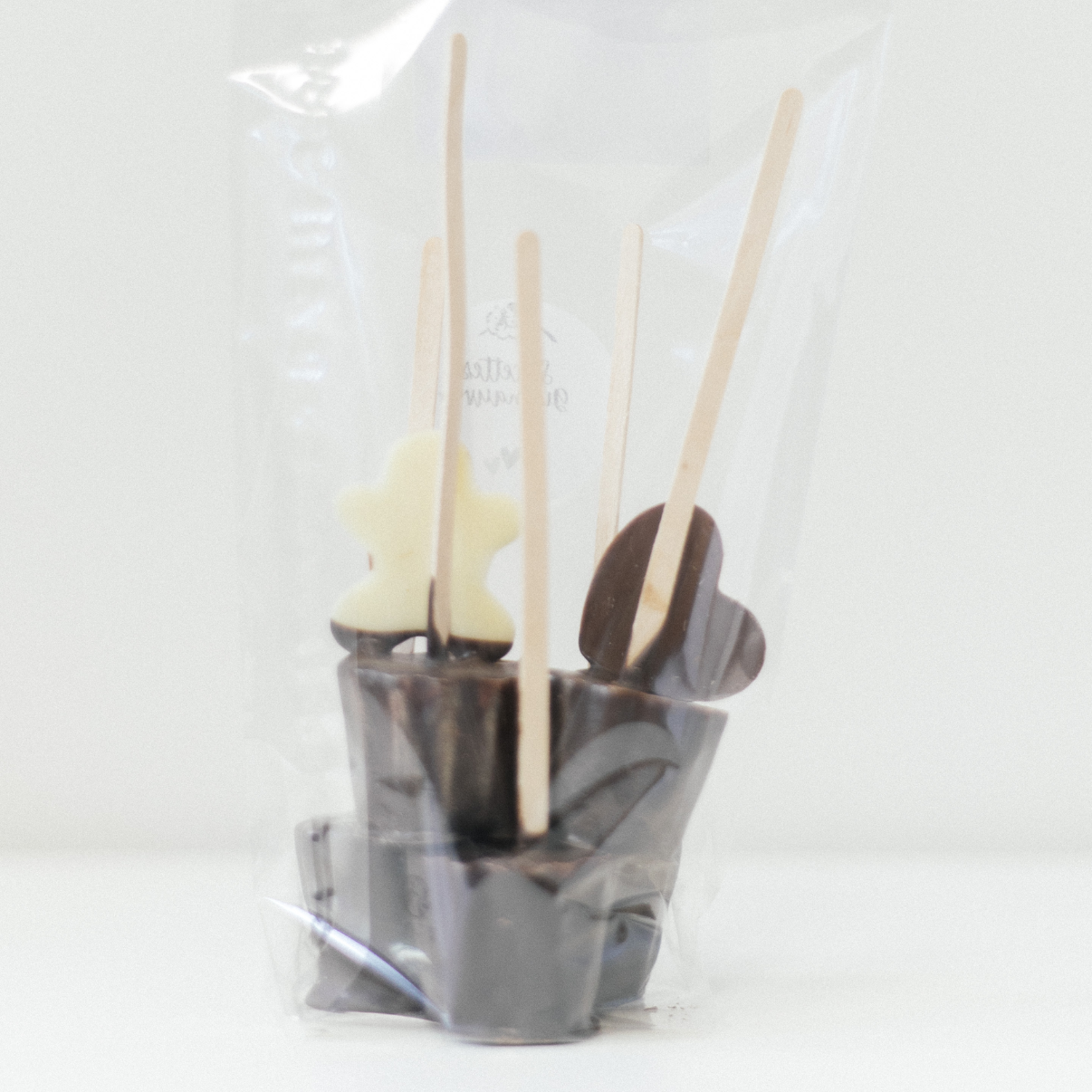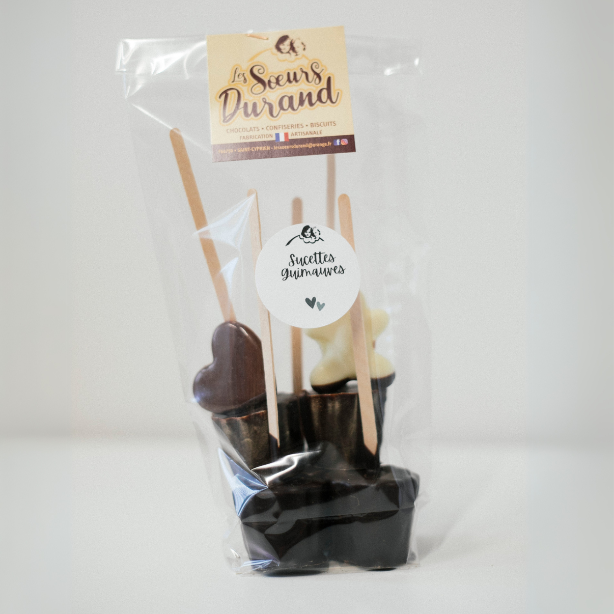 Ingrédients : Sucre cristal, sucre inverti, couverture noire 55%, chocolat blanc, gélatine alimentaire bovine (contient des sulfites), eau, arôme vanille
