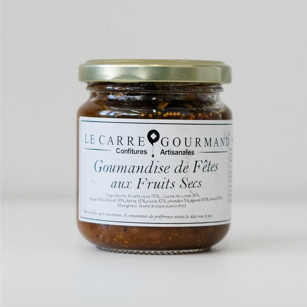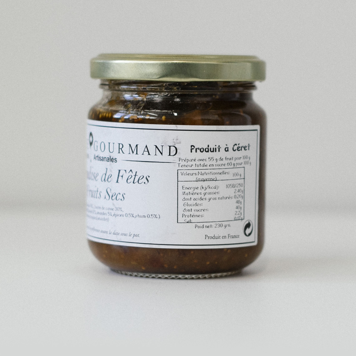 Suggestions de dégustation : Cette gourmandise de fruits secs accompagnera parfaitement le foie gras, mais se dégustera aussi avec une thé chaud sur une tranche de pain d'épices ou une brioche.